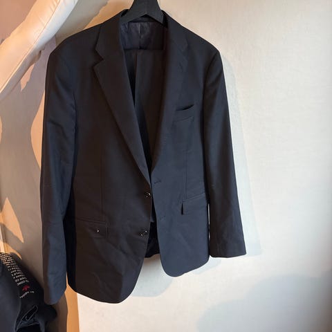 Dressjakken er str 44 og buksen str 31/30. dressen er i ull/polyester. Kan selges hver for seg og sendes. Da til 300 kr pr del eller samlet for 500kr. Porto kommer i tillegg.