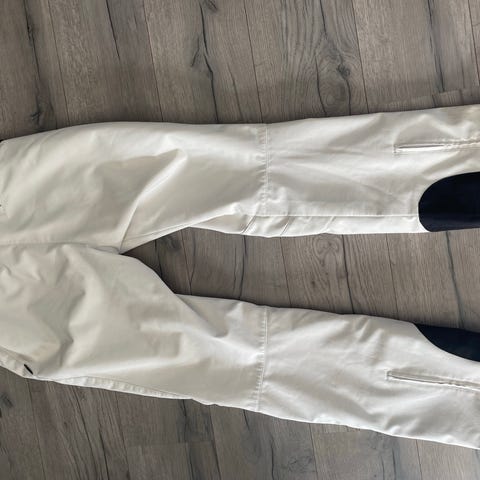 Hvite skibukser for dame. Buksene har figurnær passform med lett utsvingte ben nederst, tilpasset bruk med skistøvler eller snowboardstøvler. De har sømmer over knærne for bedre bevegelighet og forsterkninger nederst på bena. Egnet til bruk i alpinbakke og annen vinteraktivitet. Materialet fremstår som et teknisk stoff med noe stretch. PEFEKT TIL PÅSKEN☀️