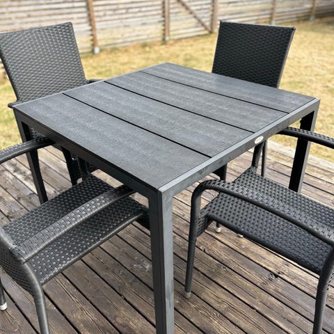 Hagemøbelsett med rektangulært bord og fire stoler. Bordet har plate med langsgående lameller og ramme i metall. Stolene har armlener og sete/rygg i flettet kunstrotting. Settet passer til uteplass, terrasse eller hage, og gir sitteplass til fire personer rundt bordet.