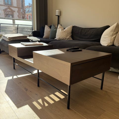 Praktisk salongbord med hevbare plater og oppbevaring – selges rimelig