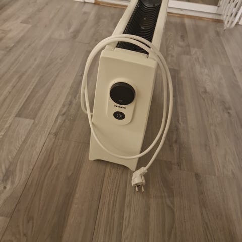 Elektrisk panelovn i hvit farge. Ovnen står på hjul for enkel flytting og har betjeningspanel i front med knapp og display. Egnet som tilleggsvarme i rom som trenger ekstra oppvarming. Kan brukes frittstående på gulv der det er tilgang til stikkontakt.