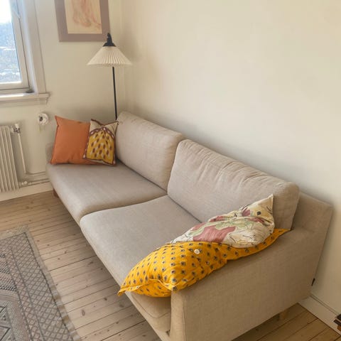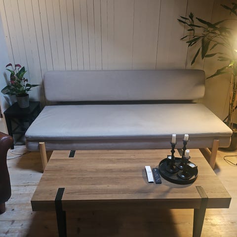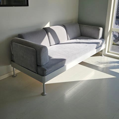 Stilig HAY sofa med 90 cm madrass som kan brukes både som vanlig sofa og sovesofa. Noe falmet pga sollys på ene siden, men fortsatt fin. Ny pris ca 20.000kr