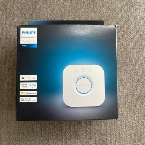 Philips Hue Bridge hvit smartbelysnings-hub. Enheten kobles til hjemmenettverket via Ethernet og fungerer som sentral styringsenhet for Philips Hue-lys og tilbehør. Bridge-en støtter tilkobling av flere Hue-lyskilder og gir mulighet for styring via app, stemmestyring og automatisering gjennom kompatible smart-hjem-plattformer. Farge: hvit.