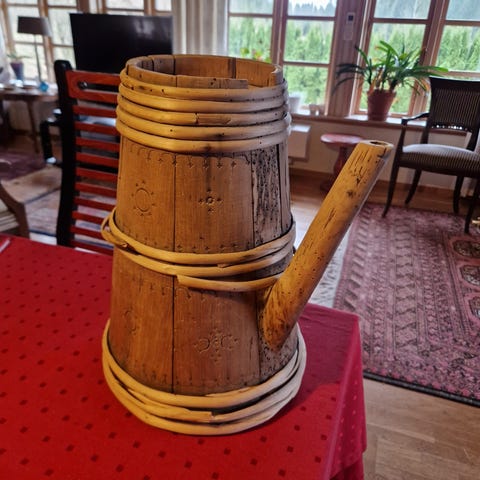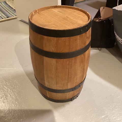 Trefat / tønner i tre med metallbånd. 63 cm per tønne. Tønnene er laget av trestaver som er holdt sammen av flere metallbånd rundt hele omkretsen. De har flat topp og bunn, og kan brukes stående. Egner seg blant annet som dekorasjon utendørs eller innendørs, til oppbevaring eller som base for ulike gjør-det-selv-prosjekter. Naturlig treverk med synlig årringstruktur og metallbånd i kontrastfarge. Det ene metallbåndet har sklidd litt opp så bare festes på nytt. Selges samlet.