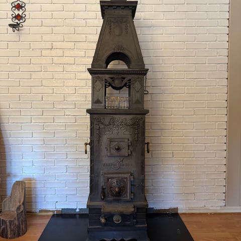 Ulefos Model 69 vedovn i støpejern. Ovnen har klassisk, dekorert utforming med flere seksjoner og utsmykkede sider og dører. Frontdøren er merket «Ulefos» og «Model 69». Passer som varmekilde og interiørelement i eldre hus, hytter eller rom der man ønsker en tradisjonell støpejernsovn. Må hentes i Fagernes
