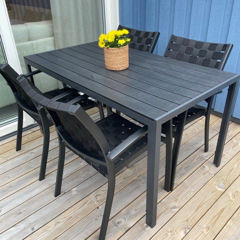 Et bord med fire stoler selges samlet. Må hentes på Tranby.