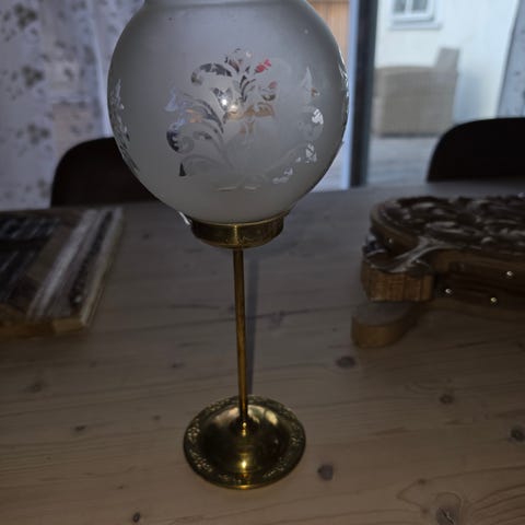 Denne lysestaken er veldig gammel. Det er flott glasskuppel mønster i glasset.Den er 40 cm høy. Det er litt smått merke på staken men jeg synes ikke det viser noe. Den er gammel og var veldig dyr. Husker ikke hvor den ble kjøpt.Selges veldig billig.