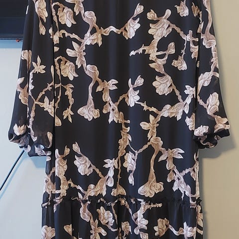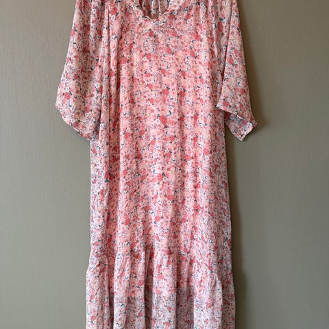 Selger en fantastisk flott og komfortabel maxikjole med et nydelig abstrakt mønster i rosa, lilla og sorte toner. Kjolen er kun brukt en enkelt gang og fremstår som helt ny.
