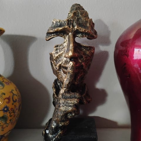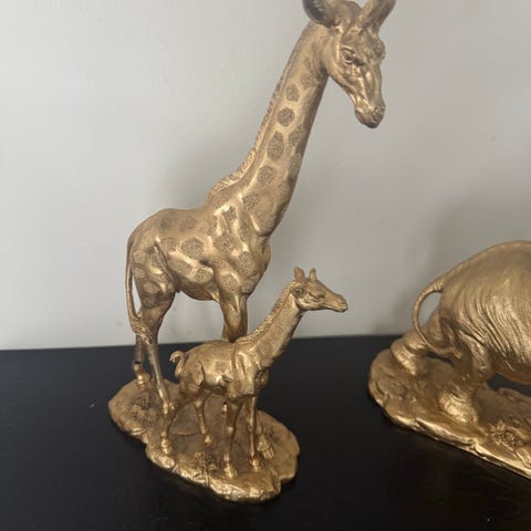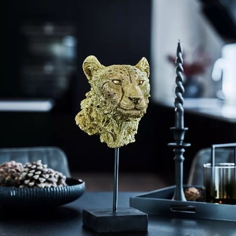 Dekorativ skulptur utformet som et leopardhode på sokkel. Skulpturen er gullfarget og står på en firkantet base med stang som holder hodet. Passer som interiørdekorasjon på bord, hylle eller kommode i stue, gang eller andre oppholdsrom. 40 cm høyde.
