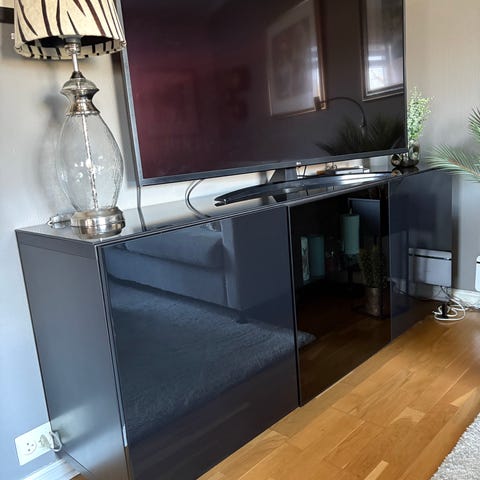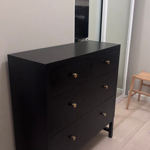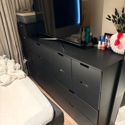 Svart kommode med 8 skuffer. Vi har brukt den på soverommet med kan brukes i alle rom.