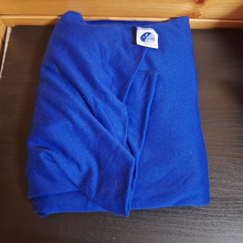 Bæresjal i blå bomull fra Love Radius. Sjalet er egnet til å bære barn tett inntil kroppen og kan knytes på ulike måter for å gi støtte og avlastning.