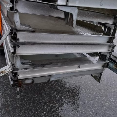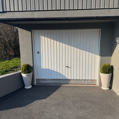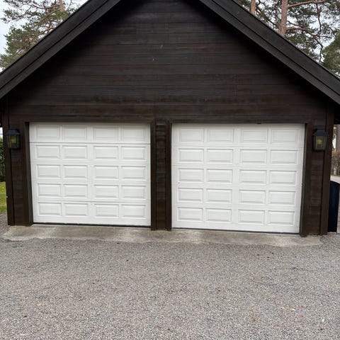 Godt brukt port med defekt åpner og knekt fjær. Trenger kun bytte fjær og wire for at porten skal fungere manuelt, men åpner må også repareres / byttes for automatisk åpning. Porten var opprinnelig hvit, men er malt. En liten skade på en speilseksjon. (Se eget bilde)Gis bort mot snarlig demontering og henting. Bistår i demontering.