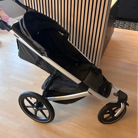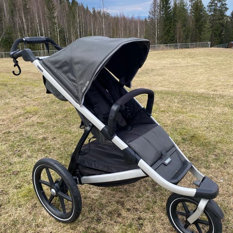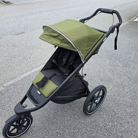 Thule barnevogn med tilhørende liggedel og sportsvognsdel i grønn og svart.