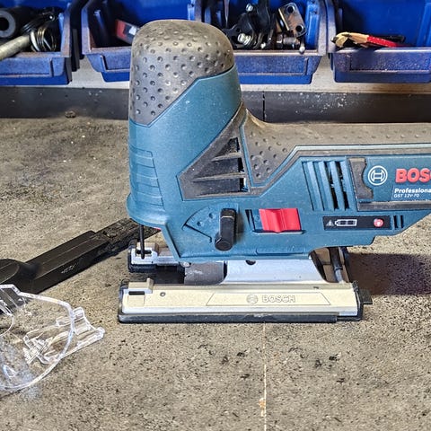 Velfungerende Bosch GST 90 E Professional stikksag. Elektrisk stikksag egnet for presise kutt i tre og andre materialer, avhengig av valgt blad. Modellen har justerbar hastighet via bryter på baksiden og sålesko for stabil føring langs arbeidsflaten. Passer til generelt snekkerarbeid, innredning og tilpasning av materialer der det er behov for buede eller rette kutt.