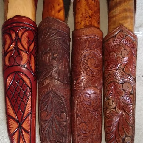 Meget spesiell kniv med preget lærslire for oppheng. Håndtaket er laget av sibirsk bjørk med metallavslutninger.