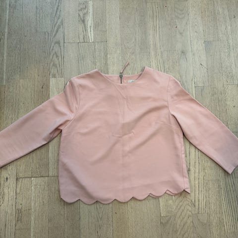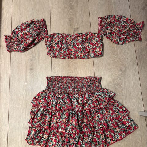 Bik Bok sett med skjørt og topp til dame i størrelse S. Sett i ensfarget rosa. Toppen har rund hals, halvlange ermer og glidelås i ryggen. Skjørtet er rett, har strikk i livet og glidelås bak. Passer til hverdagsbruk eller enklere penbruk. Materiale er ikke oppgitt på lappen, men fremstår som et glatt og lett stoff.