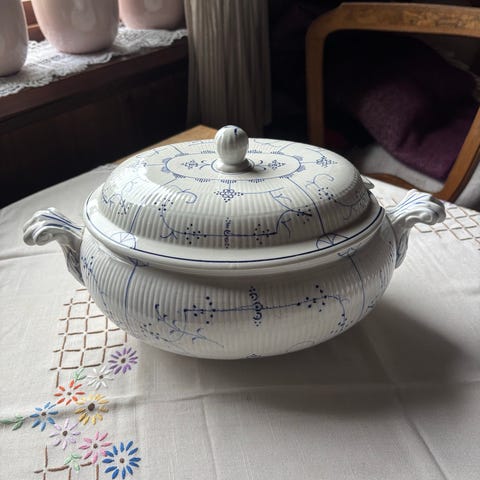 Selger en usedvanlig vakker antikk terrin med lokk fra Villeroy & Boch. Høyde 28 cm / diameter 30 cm.