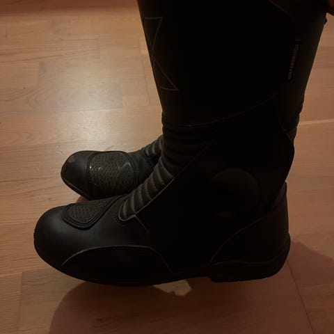 Godt brukt. Mangler ene platen på skoen, og noe søling på andre skoen.