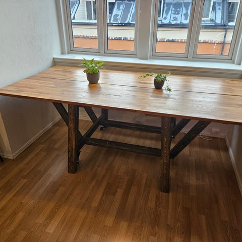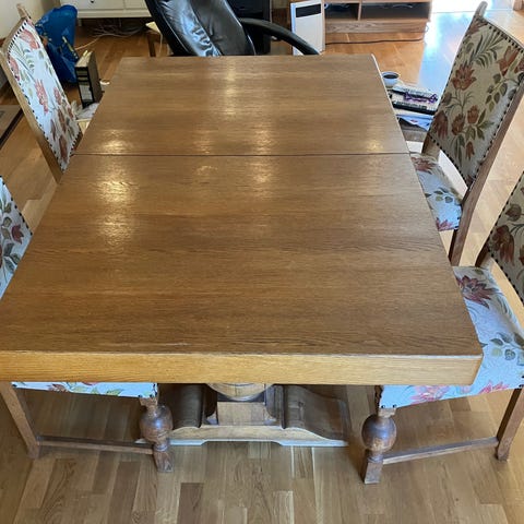 Dette er et unikt spisebord med 6 stoler. Bordet har tre illeggeplater, og kan brukes som langbord eller rundt bord. Dette er heltre, med nydelige utskjæringer. Er dansk. Svært pent bruk. Diameter på bordet er 115 cm når det er rundt, høyde er 74 cm og stolene har sittehøyde på 45 cm. Ileggsplatene er 42 cm hver og bordet blir da 2.60 langt.