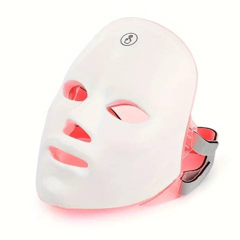 LED hudpleiemaske for ansikt og hals i hvit farge. Masken består av en fleksibel ansiktsdel og en egen del for halsen, med utsparinger for øyne, nese og munn. Settet inkluderer kontrollenhet med flere lys- og tidsinnstillinger, tilkoblingskabel, elastiske stropper/fester og bruksanvisning. Egnet for hjemmebruk til lysbehandling av hud i ansikt og hals. Unisex-modell som kan brukes av voksne.