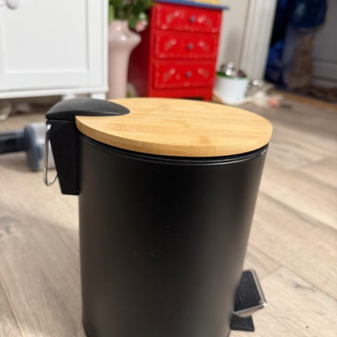 Hvit baderomsbøtte med lokk. Bøtten har avrundet, konisk form og integrerte håndtak i kanten for enkel flytting. Innsiden er mørk og tilpasset bruk med pose. Lokket er polstret og har hempe for enkel åpning og lukking. Egner seg til oppbevaring eller som avfallsbøtte på bad eller vaskerom.Hardplast
