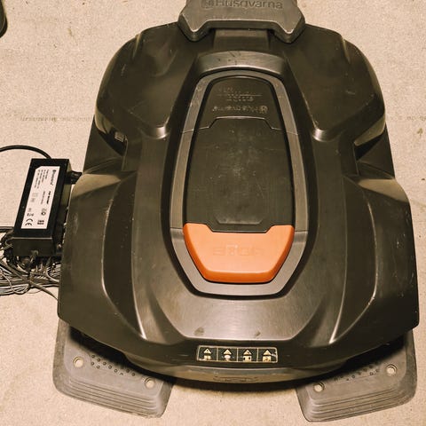 Selges som den er. Kontakt for spørsmål eller visning.Husqvarna Automower robotgressklipper med tilhørende ladestasjon og lader.