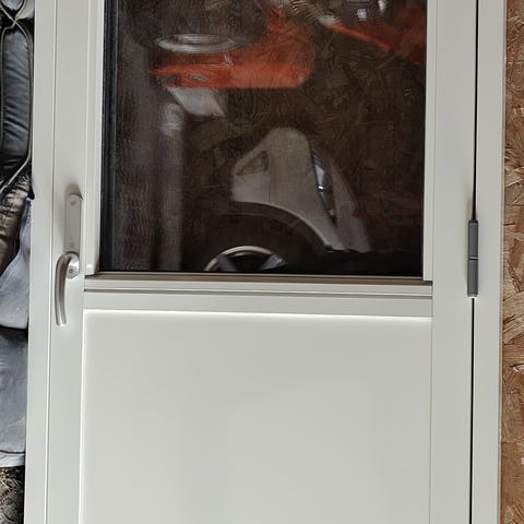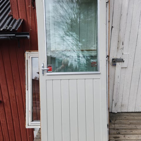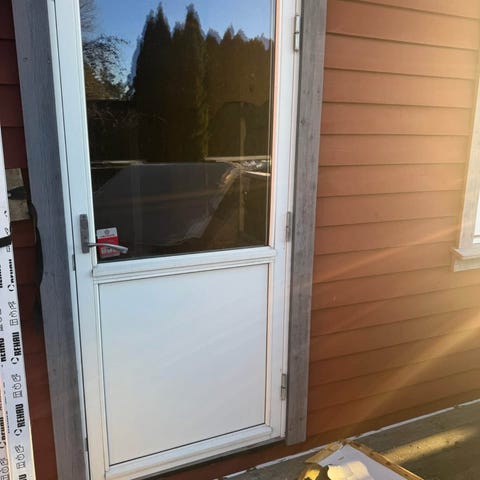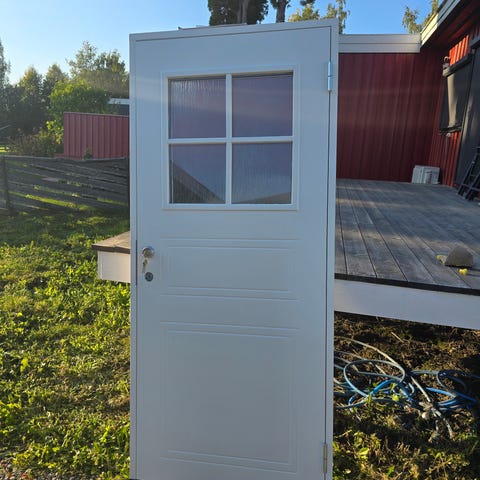 Trenor balkong/terassedør med stort glassfelt i øvre del og profilert, tett fylling i nedre del. Døren er hvitmalt og leveres i karm, med montert låskasse og vrider. Konstruksjonen er i tre, tilpasset bruk som ytterdør i bolig eller hytte. Glasset slipper inn godt med dagslys, samtidig som den tette nedre delen skjermer mot innsyn og vær. Modulmål er 90*210, eksakte mål er 89*209cm.