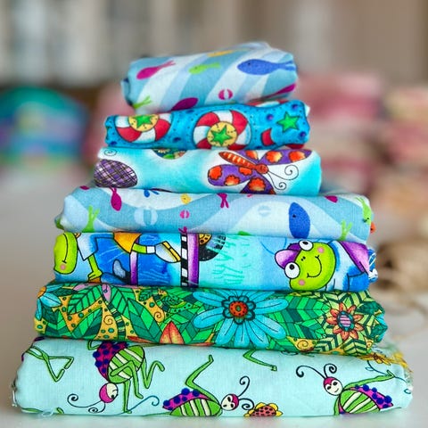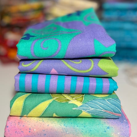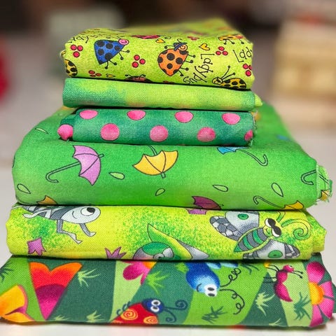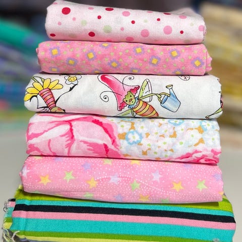 Selger en pakke med bomullsstoffer til lappeteknikk/quilting