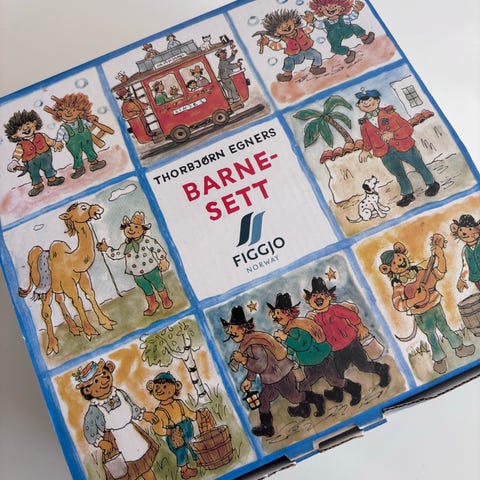 Barneservise i porselen fra Figgjo med flott motiv fra Hakkebakkeskogen. Helt nytt i esken.