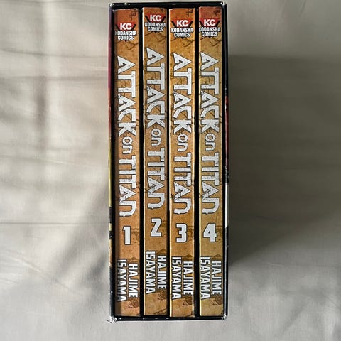 Attack on Titan Omnibus manga bøker som samler volum 1–3 og 4–6 i serien. Bøkene er på engelsk og inneholder samlet flere kapitler av manga-serien Attack on Titan av Hajime Isayama.