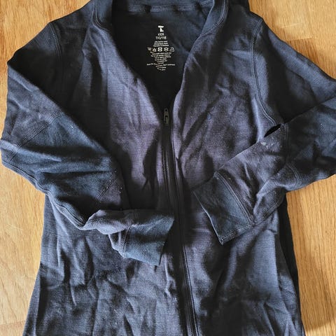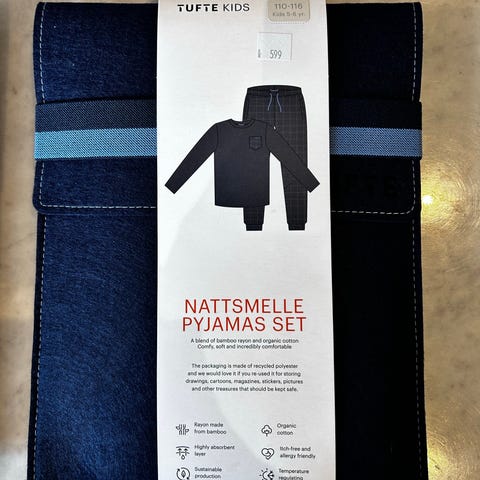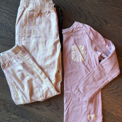 Pent brukt pyjamas fra Tufte. Bambus/bomull, str 110/116, mørk blå genser og lys grønn bukse.