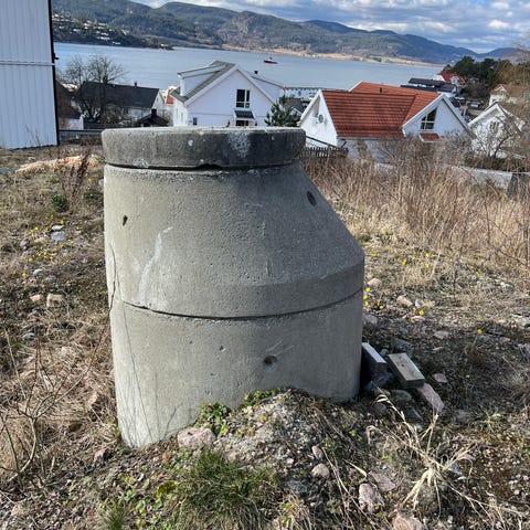 Gamle avløpsrør av betong. 60-80 cm lange, 10 cm innerdiameter og 14 cm ytterdiameter. Ett litt større og tre stumper. Brukbart som støperør, kanskje? Må hentes.