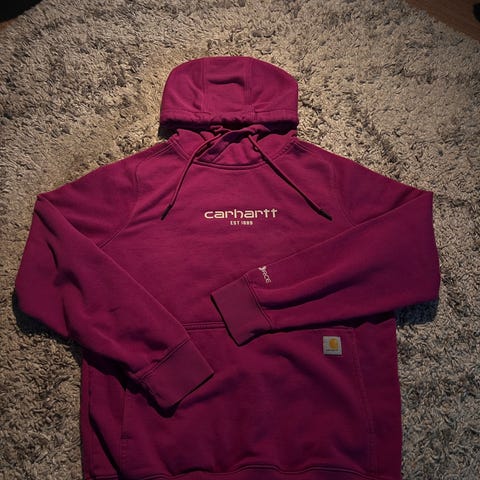 Carhartt genser for herre i størrelse S. Genseren er rød og laget i bomull. Klassisk rund hals med ribbestrikket hals, ermer og linning. Myk, børstet innside for økt komfort. Liten Carhartt-logo på ermet. Passer til hverdagsbruk og som et lag over t-skjorte eller under jakke.