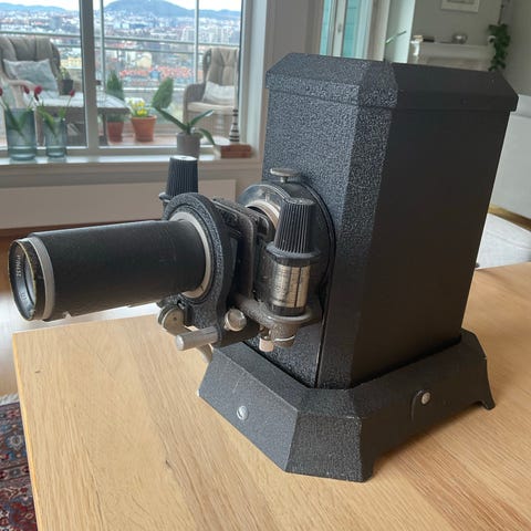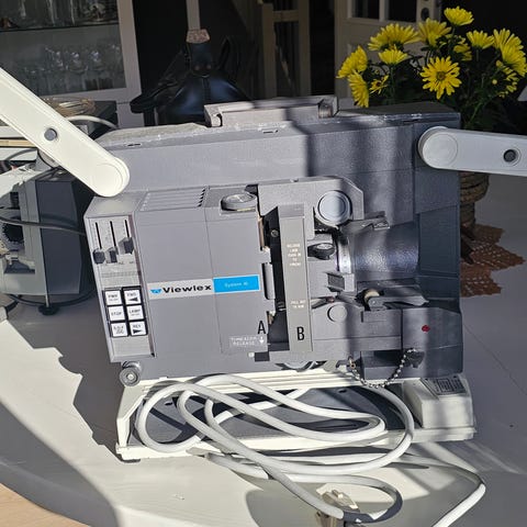 Eiki ST-2H filmprojektor for 16mm film i grå utførelse. Modellen er fra Eiki Industrial Co. Ltd. og tilkobles strøm via vanlig nettkabel. Projektoren har innebygd høyttaler i lokket, med tilkobling via intern kabel. Frontpanelet har kontroller for blant annet av/på, frem- og tilbakespoling samt justering av avspillingshastighet. Egner seg til visning av 16mm film i undervisning, arkiv eller hjemmebruk der man har behov for avspilling av analoge filmruller. Kom med bud