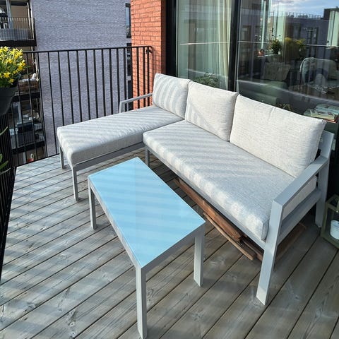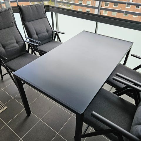 Bordet er stødig og vedlikeholdsfritt og har hull i midten til parasoll.