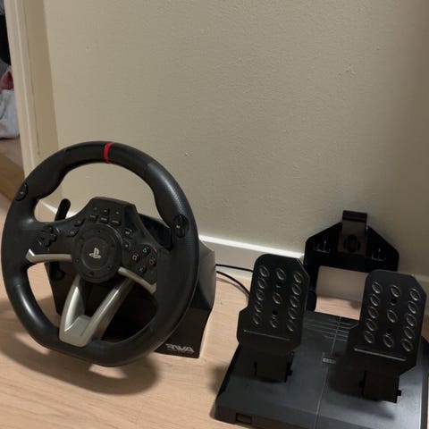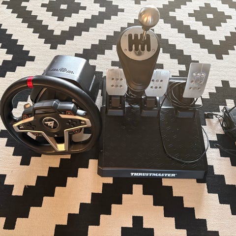 Thrustmaster T128 ratt og pedaler med force-feedback til spillkonsoll. Settet består av ratt med innebygde knapper for styring av menyer og spillfunksjoner, samt pedalsett med gass- og bremsepedal på sklisikker base.