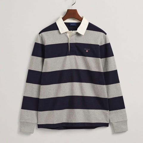Brukt Gant genser for herre i størrelse XXL. Genseren er grå med stripemønster og har krage og knappestolpe i halsen. Laget i bomull, som gir et mykt og behagelig plagg til hverdagsbruk.