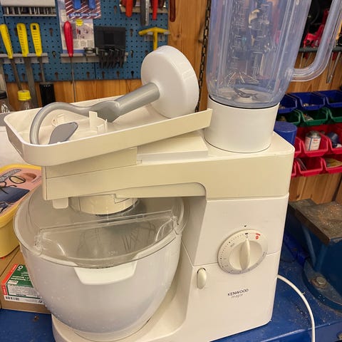 Kenwood kjøkkenmaskin , se bilder. Denne maskinen er veldig gammel, så den bråker en del mer enn nye maskiner. Følger også med en blender i glass.