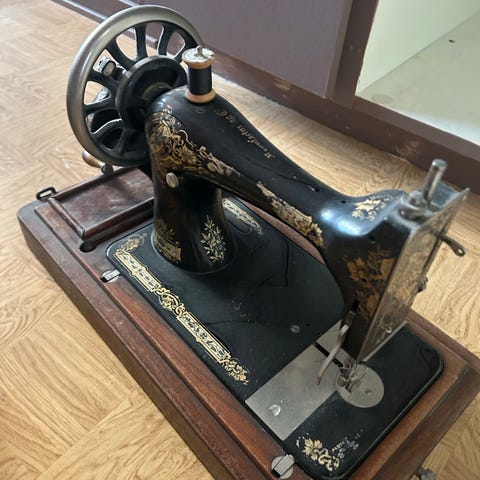 Tilstand: Mekanikken beveger seg fint når man sveiver. Den har stått urørt som dekorasjon, så jeg har ikke testet selve syfunksjonen eller sjekket alle smådeler innvendig. Den selges derfor som den er – perfekt for samlere, som interiørskatt, eller for de som vil sette den i stand til teknisk bruk.