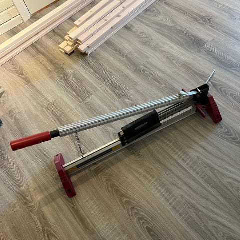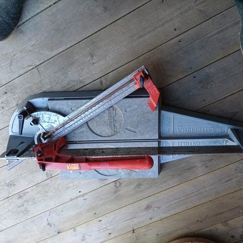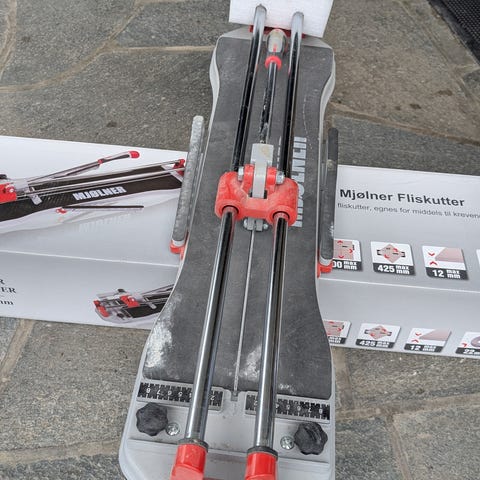 Rubi manuelt flisekutter i rød og grå farge. Kutteren er beregnet for skjæring av keramiske fliser og lignende materialer. Den har styreskinne, håndtak for trykk og integrert anlegg for å holde flisene på plass under kutting. Egnet for rette kutt på gulv- og veggfliser ved oppussing og flisleggingsarbeid.