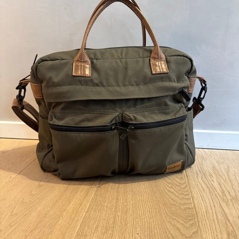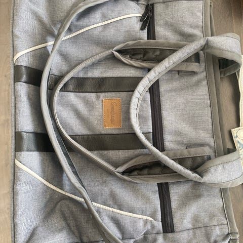 Emmaljunga stelleveske i grått stoff, med tilhørende stellematte. Så godt som ubrukt.