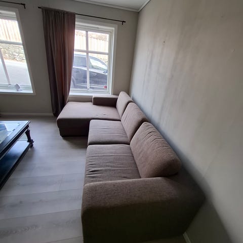 Sofaen er fin og fullt fungerende, men har en knekt planke under som er reparert med solid lim og teip.