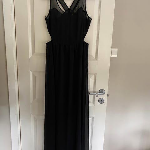 H&M festkjole for dame i størrelse 36. Kjolen er svart og laget av polyester. Modellen er lang med markert midje og ermeløst snitt. Baksiden har dekorative kryssede stropper og utskjæringsdetalj øverst. Passer til formelle anledninger og festbruk. Kjolen er litt tynn i stoffet, men har kort underskjørt.