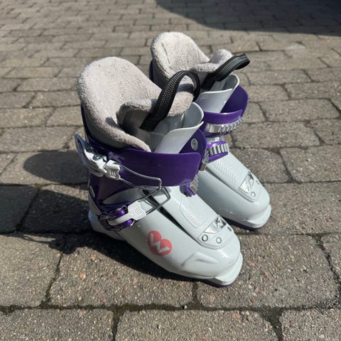 Barne skistøvler i hvit og lilla plast med to justerbare spenner på hver støvel. Myk, polstret innersko for komfort og støtte rundt ankel og legg. Passer til alpinski med vanlig alpint bindingssystem. Egnet for barn som trenger stabile og enkle skistøvler til bruk i skibakken.