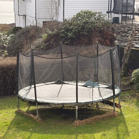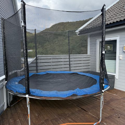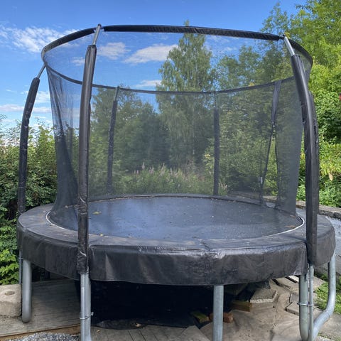 Trampoline gies bort mot henting og demontering. Sikkerhets nettet har fått litt medfart, men kan fortsatt brukes. Eske kan fåes med om ønskelig til å frakte den i. Må nok ha en liten vask.