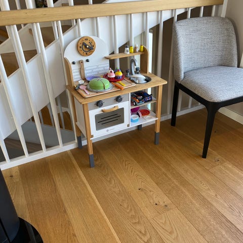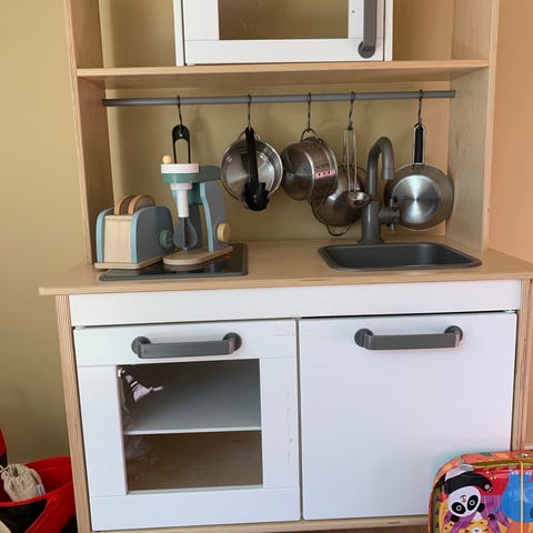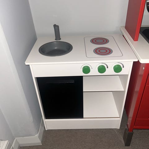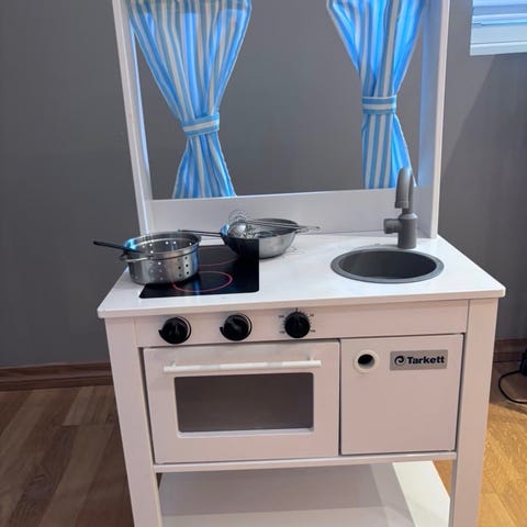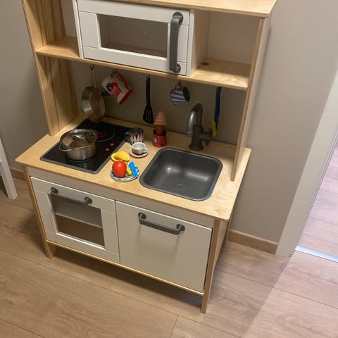 IKEA lekekjøkken i tre med hvite fronter. Kjøkkenet har vask med kran, platetopp, mikroovn og oppbevaringsskap. Det følger med noen enkle kjøkkenredskaper og lekemat, slik som vist på bildene. Passer til barn som liker rollelek på kjøkkenet.
