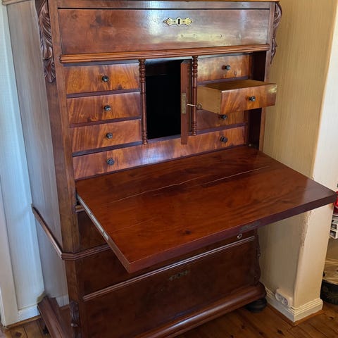 Vakkert skatoll i furu kledd med trefiner. Slitasje merker på bordplate.
