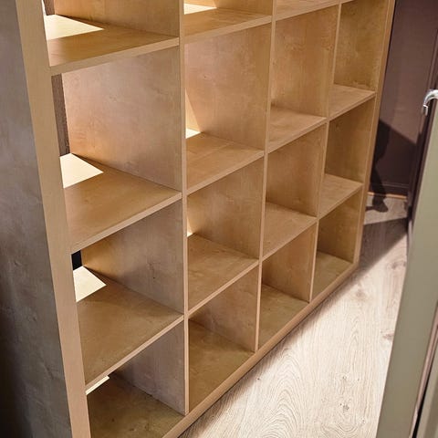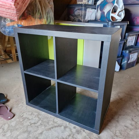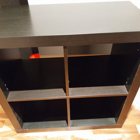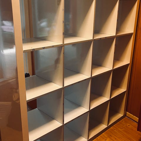 Hyllen har 8 «rom». Mål: 148x148 cm dybde 39 cm