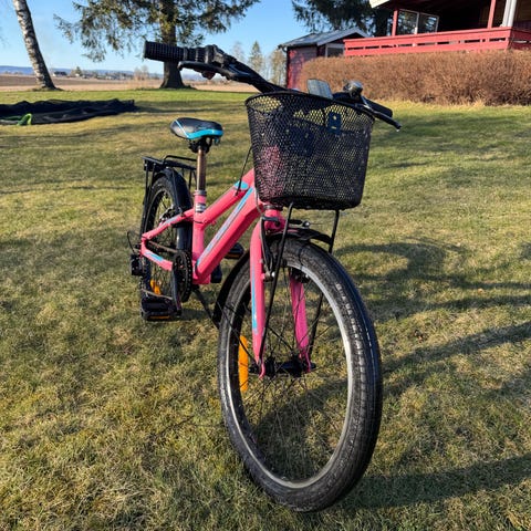 Bottecchia barnesykkel med 20" hjul. Sykkelen har lav innsteg-ramme som gjør det enklere å komme av og på. Fargekombinasjon i rosa med hvite detaljer, inkludert skjermer og bagasjebrett bak. Setet er polstret og justerbart i høyden. Styret har håndbremser og ringeklokke samt gir. Sykkelen har kjedebeskyttelse og kurv foran for enkel transport av mindre gjenstander. Passer som barnesykkel i størrelse 20" for barn som har vokst ut av mindre hjulstørrelser. Slangen bak må byttes, da man ikke får inn luft.