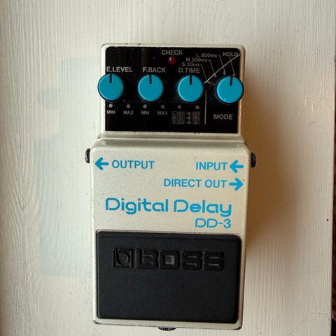 Boss DD-3 Digital Delay gitarpedal. Kompakt effektpedal for elgitar med digital delay-effekt. Pedalen har kontroller for justering av delaytid, feedback og effektmengde, samt egne utganger for Output og Direct Out. Drives med 9V batteri eller kompatibel strømforsyning (ikke vist på bildene). Egnet til bruk i pedalbrett og andre gitaroppsett der det er behov for digital delay-effekt.
